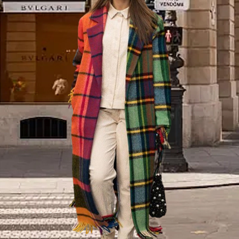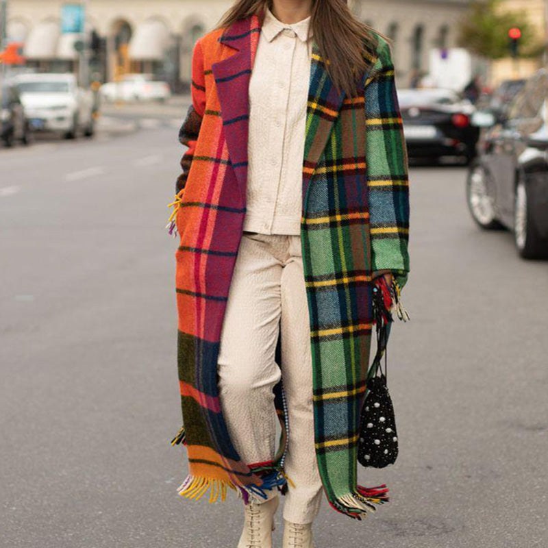 Gi vintergarderoben din et løft med Fargekollisjon Frynsad Syntetisk Yllekappa. Denne stilige kåpen kombinerer varme, mote og funksjonalitet i en og samme pakke. Med sitt iøynefallende rutete design og duskdetaljer er den perfekt for å gjøre et statement i de kaldere månedene. Den er laget av syntetisk ull av høy kvalitet, noe som gjør den like behagelig som ekte ull uten vedlikehold. Med denne uunnværlige vinterfrakken holder du deg varm, ser elegant ut og vekker oppsikt uansett hvor du går.