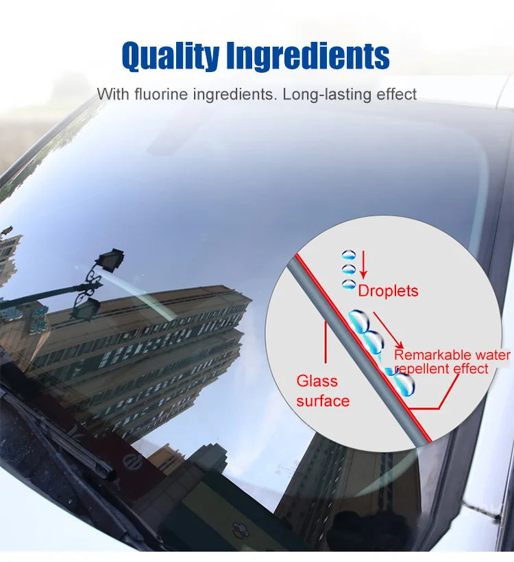 Ved bruk av nano-slipeteknologi, tilsettes oljeabsorberende partikler for å effektivt bryte ned vanlige oljefilmer, vannmerker, fugleskitt, blekk, tyggegummi og andre sta flekker på glasset. Glassoljefilmfjerner er miljøvennlig og fri for forurensning, uten korrosjon og uten skade på glasset.
