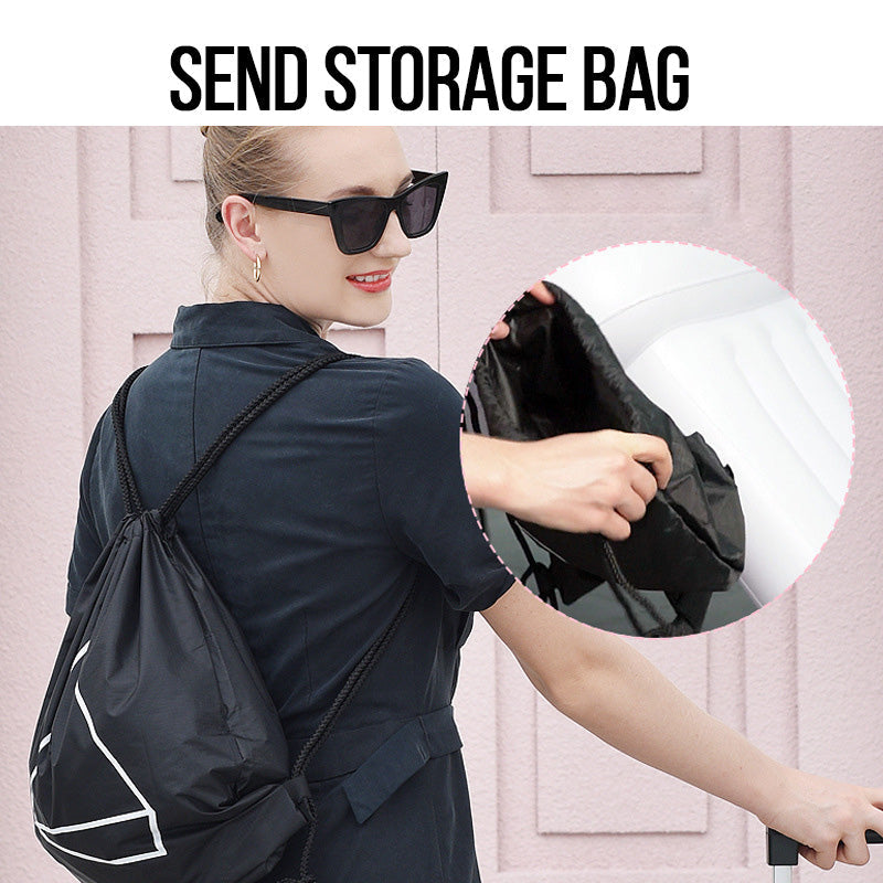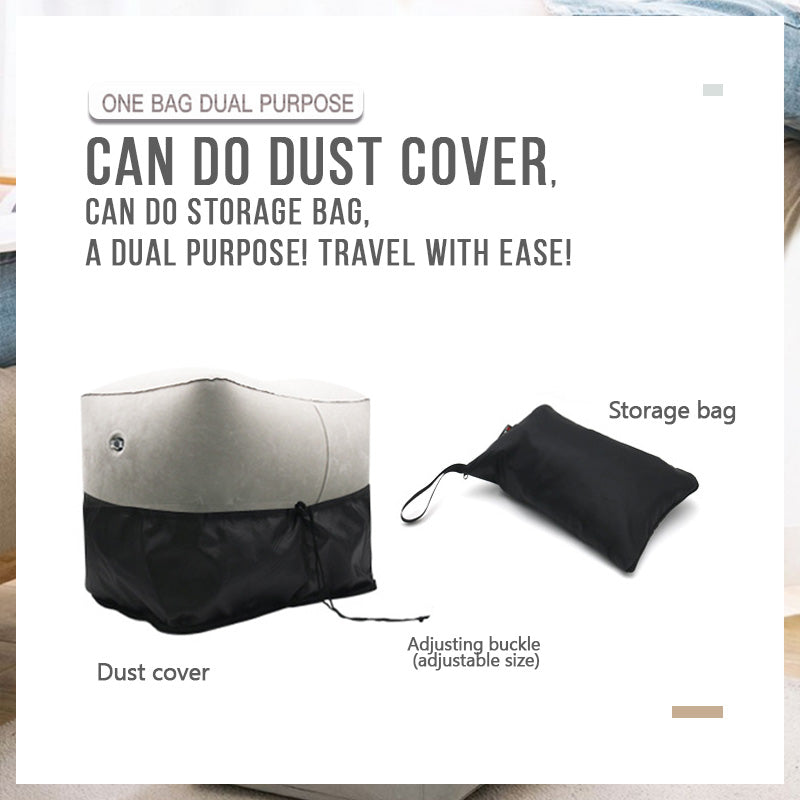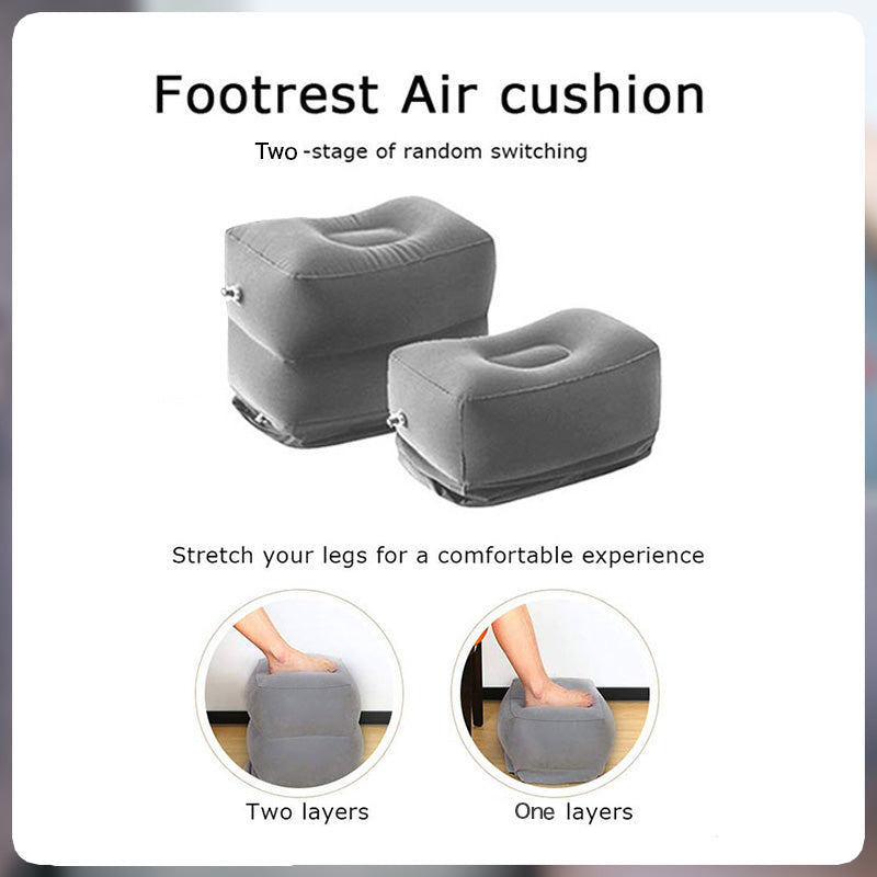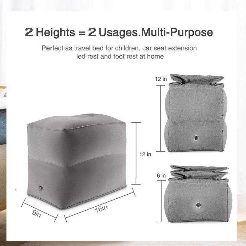 Den kan enkelt legges i en hvilken som helst ryggsekk eller koffert for å gi foretrukket benstøtte eller for å passe i trange områder. Med et multifunksjonelt støvdekseldesign kan den oppblåsbare fotstøtten også brukes som en forlengelse av hvilken som helst stol.