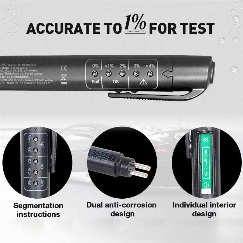 5 LED-lys viser prosentandelen av fuktighetsinnholdet i bremsevæsken, noe som gir et mer nøyaktig testresultat, olje- og oksidasjonssikkert, med god tilstand og høy presisjon.