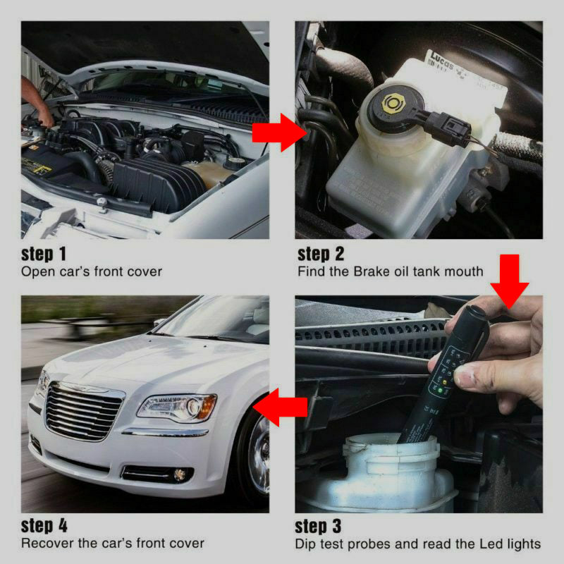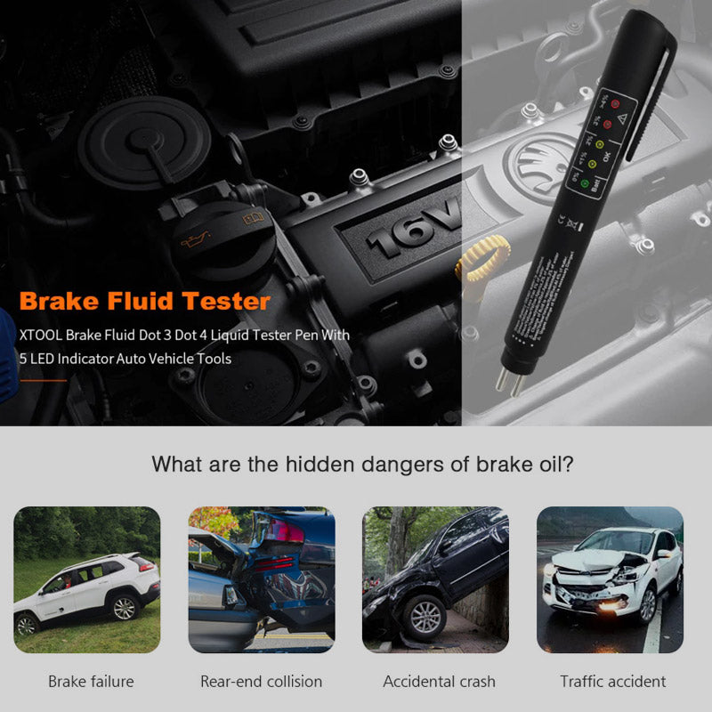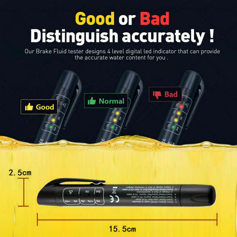 5 LED-indikatorer viser mer nøyaktige testresultater. DOT4-bremsevæske kan testes for å sikre at den fungerer som den skal. Støtter automatisk avstengningsfunksjon.