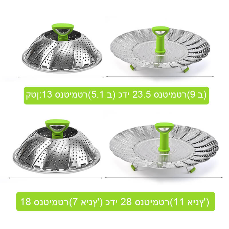 Vegetabilsk damperkurv kollapset diameter er 6 tommer. Den utvides til 11 tommer når kronbladene strekker seg. "Vingene" som brettes inn og ut, lar skipet passe til forskjellige gryte-/pannestørrelser eller en trykkoker, og gjør en hvilken som helst panne til et skip. Åpner som en vannlilje og brettes kompakt for å spare lagringsplass i motsetning til klumpete bambusdampere.