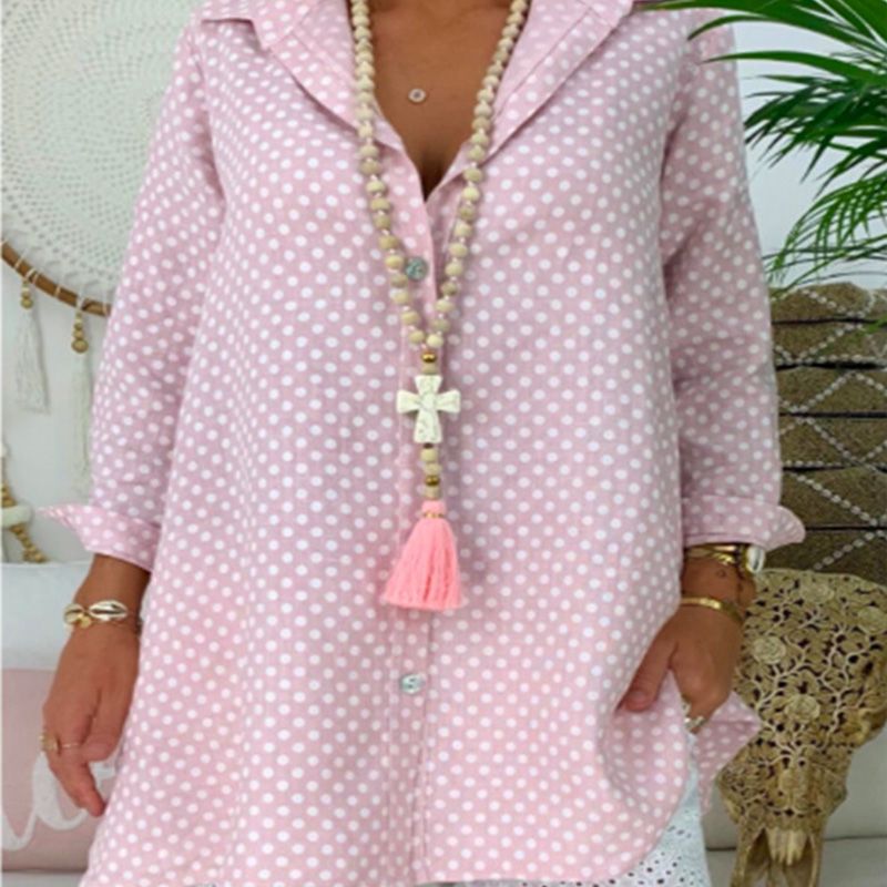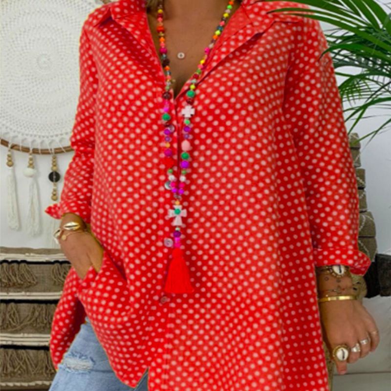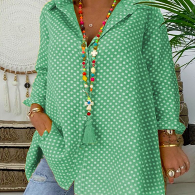 POLKAPRIKKER-TRYKK: Omfavn tidløs stil med vår prikkete trykte skjorte. Det klassiske mønsteret tilfører et lekent og feminint preg til antrekket ditt, perfekt for både uformelle og dressede anledninger.