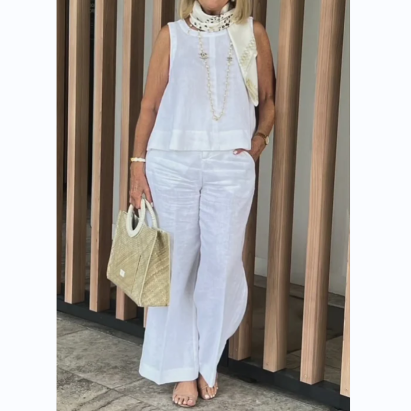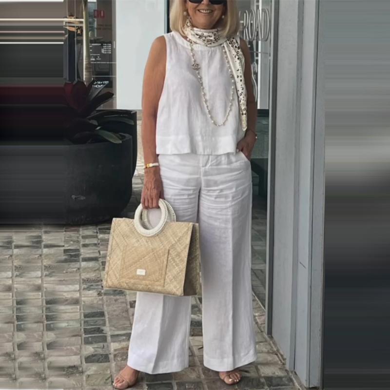 Kvinnenes Enkle Pustende Sett - Rund Hals Ermløs Topp og Vid Bein Bukser