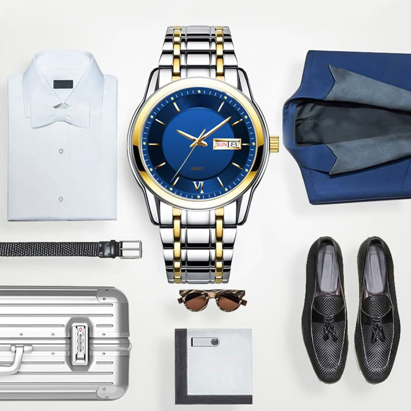 Klassisk herreklokke - Dette ultratynne, vanntette kvartsuret for menn med dobbelt kalendervindu har et klassisk sølv/gull-design, belagt speilglass og urkasse og reim i rustfritt stål. Remmen i rustfritt stål gjør klokken slitesterk og behagelig å ha på seg. Klokken har også en sammenleggbar spenne for maksimal komfort og sikkerhet.