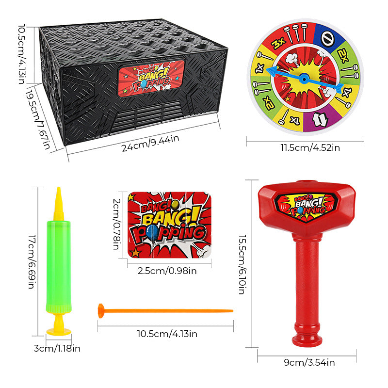 Blås opp en av ballongene (100 inkludert) og plasser den under Wack-A ballongboksen! Ta Wack!! Hammer og spiker følger med. Snurr spinneren som følger med.