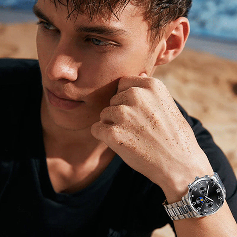 VANNTETT DESIGN: Omfavn det uventede. Denne klokken er designet med en vanntett funksjon som gjør den motstandsdyktig mot vannsprut. Den er din pålitelige følgesvenn i alt fra uventede regnskyll til spontane vannaktiviteter.