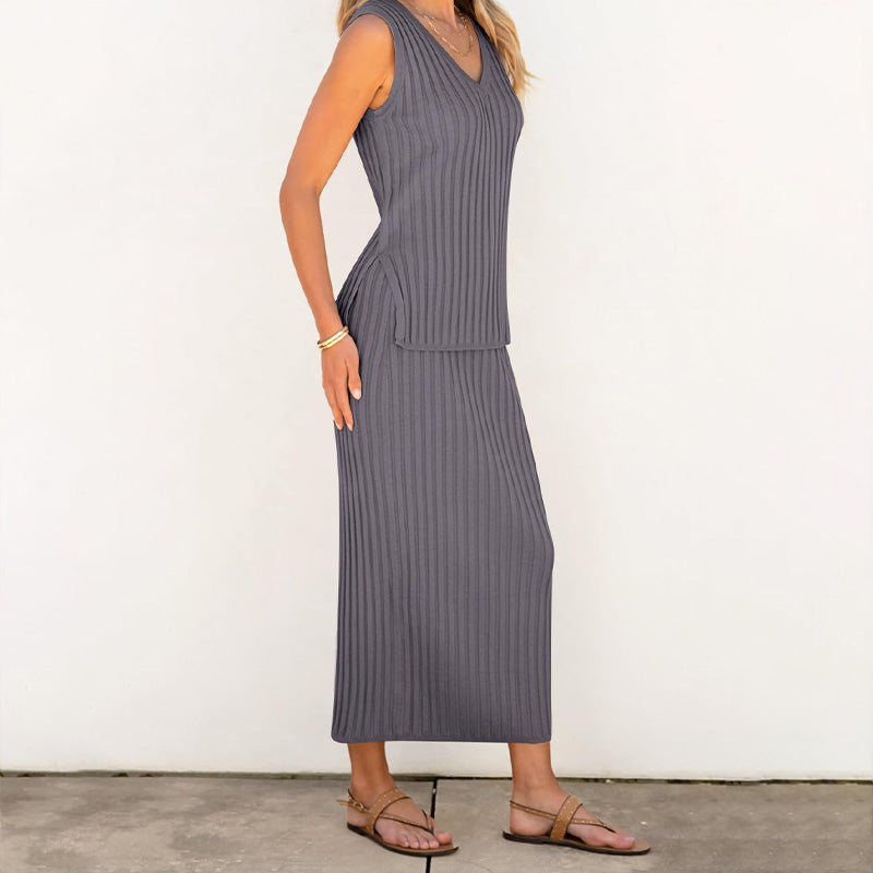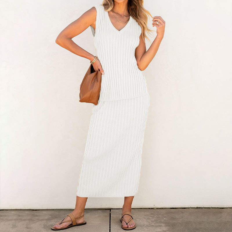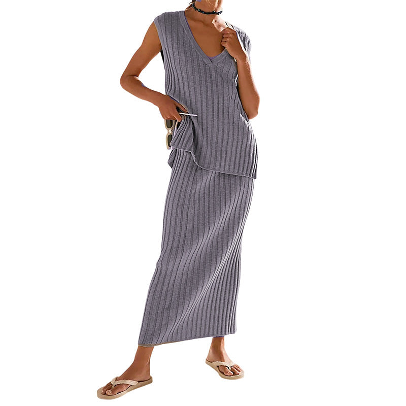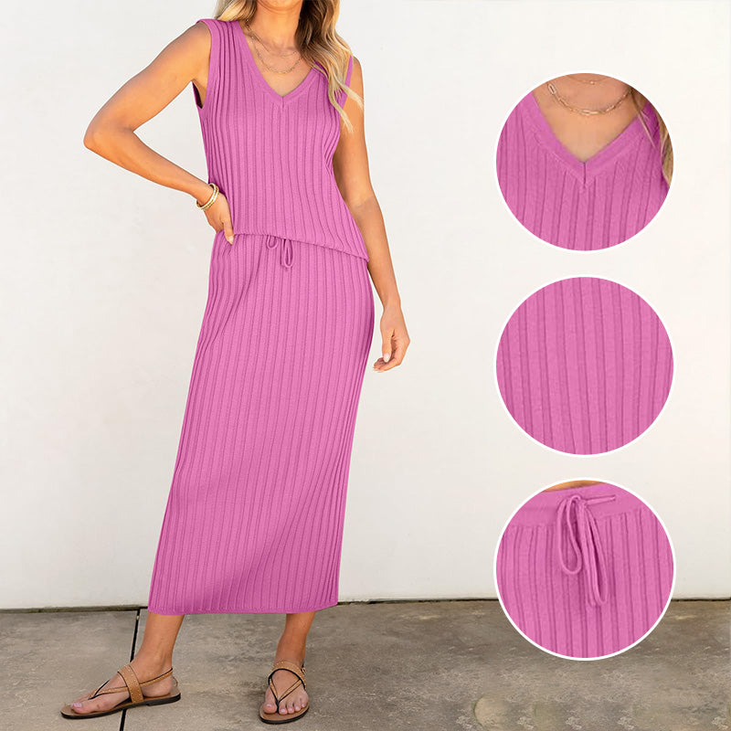 Kvinners sommerlige 2-delte strikkesett med ermeløs topp og tettsittende skjørt