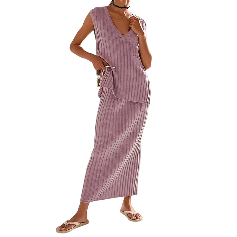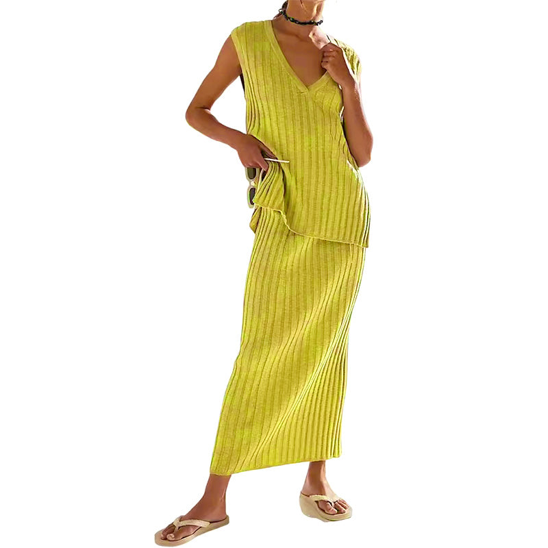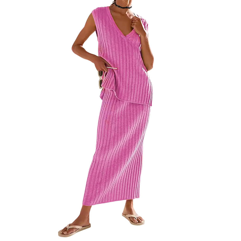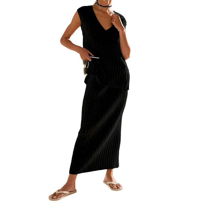 Pakken inneholder: 1 * Kvinners sommerlige 2-delte strikkesett med ermeløs topp og tettsittende skjørt
