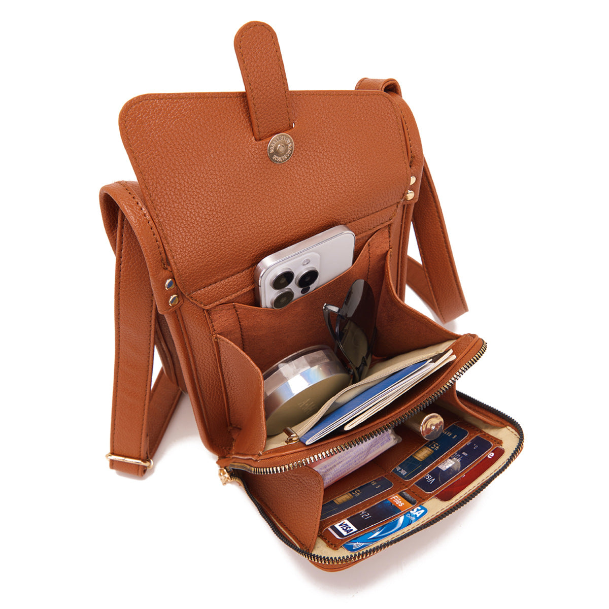 Crossbody-vesken med innebygd lommebok holder kontanter og kredittkort organisert og lett tilgjengelig. Den er også utstyrt med metallglidelåser som bedre beskytter eiendelene dine og informasjonssikkerheten.